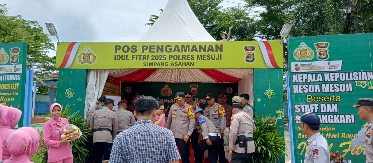 Kapolres Mesuji bersama Ketua Bhayangkari Cabang Mesuji dan Pengurus serta Para PJU memberikan bingkisan kepada Personel Pos PAM Simpang Asahan. Jumat (28/03/25)