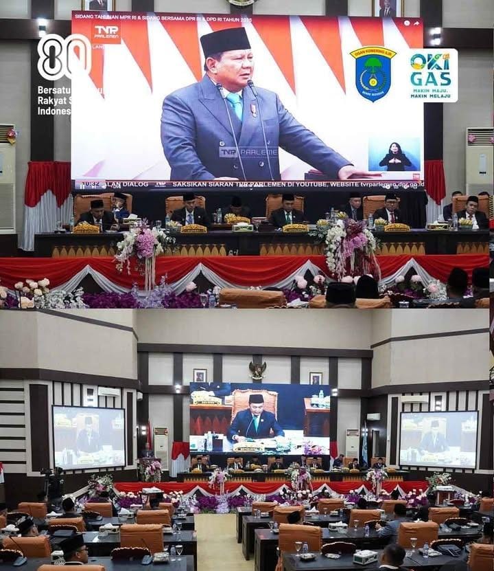 Rapat mendengarkan pidato kenegaraan Presiden RI dalam rangka HUT RI ke-80 tahun 2025 yang diselenggarakan di gedung paripurna Dewan Perwakilan Rakyat Daerah (DPRD) Kabupaten OKI berlangsung khidmat, Jumat (15/8/2025).
