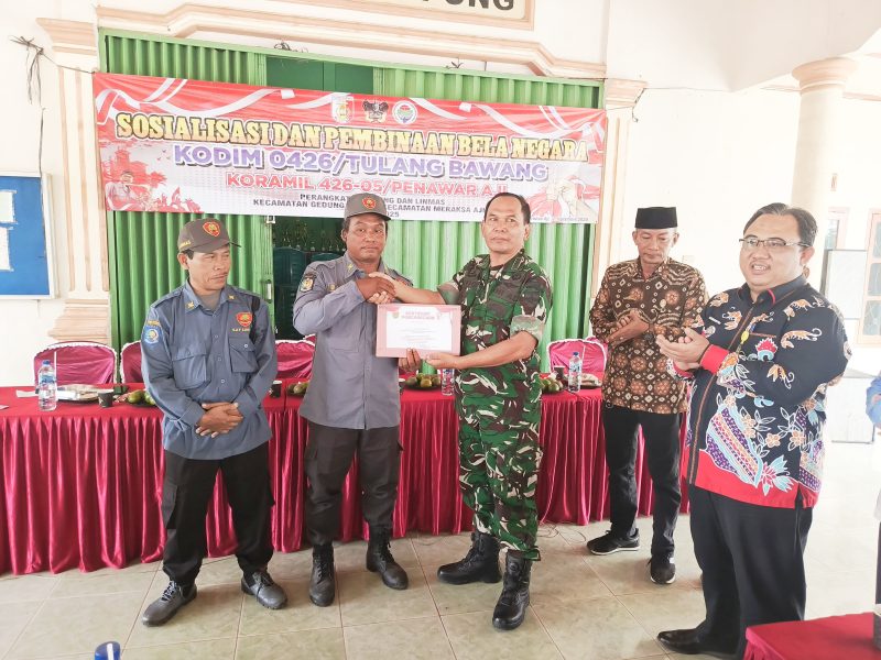 Meraksa Aji (Tulang Bawang), 11 September 2025 — Danramil 426-05 Penawar Aji, Kapten Inf Sutio, memberikan sosialisasi tentang wawasan kebangsaan dan bela negara kepada perangkat kampung dan anggota Linmas dari wilayah Kecamatan Meraksa Aji dan Kecamatan Gedung Aji. Kegiatan ini dilaksanakan di Kampung Bina Bumi, Kecamatan Meraksa Aji, Kabupaten Tulang Bawang.