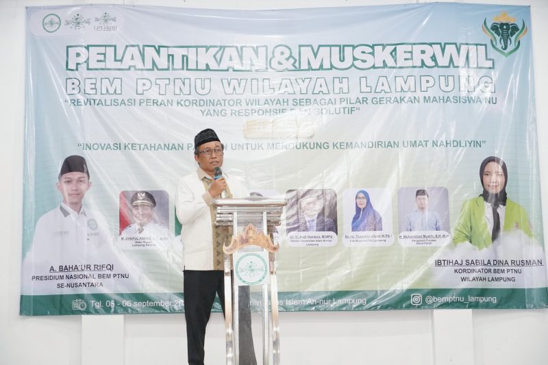 Gubernur Lampung yang diwakili oleh Kepala Dinas Komunikasi, Informatika, dan Statistik Provinsi Lampung, Ganjar Jationo, menghadiri Pelantikan dan Musyawarah Kerja Wilayah Badan Eksekutif Mahasiswa (BEM) Perguruan Tinggi Nahdlatul Ulama (PTNU) Wilayah Lampung. Acara ini berlangsung di Gedung Serba Guna Universitas An Nur, Lampung Selatan, Jumat (05/09/2025).