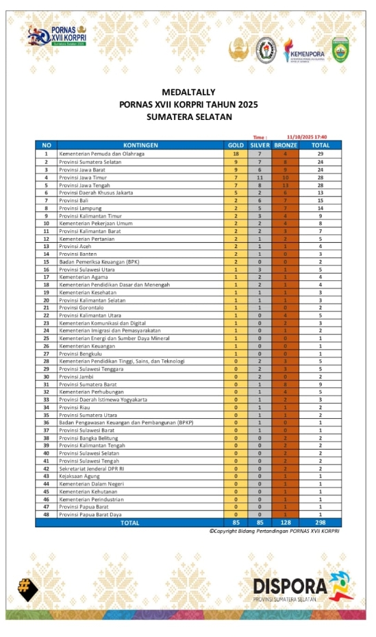 Semangat juang dan dedikasi tinggi aparatur sipil negara (ASN) asal Sai Bumi Ruwa Jurai kembali berbuah manis. Kontingen Lampung sukses menorehkan prestasi gemilang dalam Pekan Olahraga Nasional Korpri (Pornas Korpri) XVII Tahun 2025 yang digelar di Palembang, Sabtu (11/10/2025).