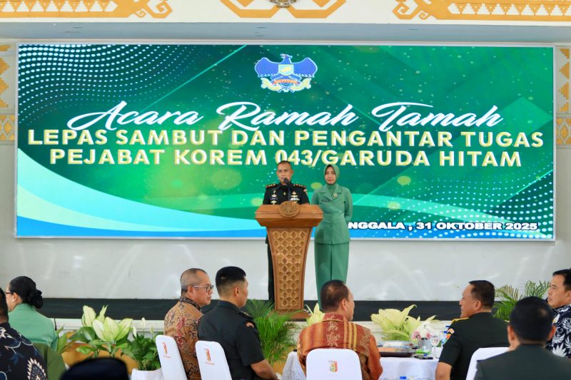Menggala (Tulang Bawang) — Komandan Korem 043/Garuda Hitam Brigjen TNI Haryantana, S.H., memimpin langsung upacara Serah Terima Jabatan (Sertijab) Komandan Kodim (Dandim) 0426/Tulang Bawang, pada Jumat (31/10/2025). Kegiatan berlangsung di Gedung Serba Guna (GSG) Jalan Cemara, Gunung Sakti, Kelurahan Menggala Selatan, Kecamatan Menggala, Kabupaten Tulang Bawang.