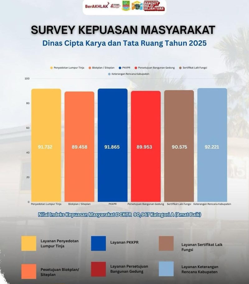 Dinas Cipta Karya dan Tata Ruang (DCKTR) Kabupaten Bekasi mencatat capaian positif melalui hasil Survei Kepuasan Masyarakat (SKM) periode Januari–Oktober 2025. Berdasarkan hasil survei tersebut, DCKTR berhasil meraih nilai indeks 90,967 dan masuk dalam Kategori A (Amat Baik).