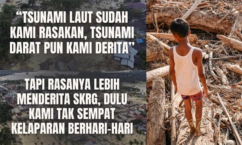 “Tsunami laut sudah kami rasakan, tsunami darat pun kami derita. Tapi rasanya lebih menderita sekarang, dulu kami tak sempat kelaparan berhari-hari.” Meme berisi keluh-kesah korban bencana semacam ini menyebar di berbagai platform media sosial.