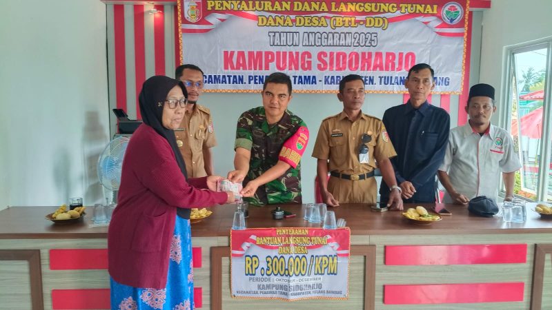 Penawar Tama (Tulang Bawang) — Babinsa Koramil 426-04 BA Kodim 0426/Tulang Bawang, Sertu Kamsudin, melaksanakan pendampingan kegiatan pembagian Bantuan Langsung Tunai Dana Desa (BLT-DD) kepada warga masyarakat di Kampung Sidoharjo, Kecamatan Penawar Tama, Kabupaten Tulang Bawang, pada Selasa 15 Desember 2025.