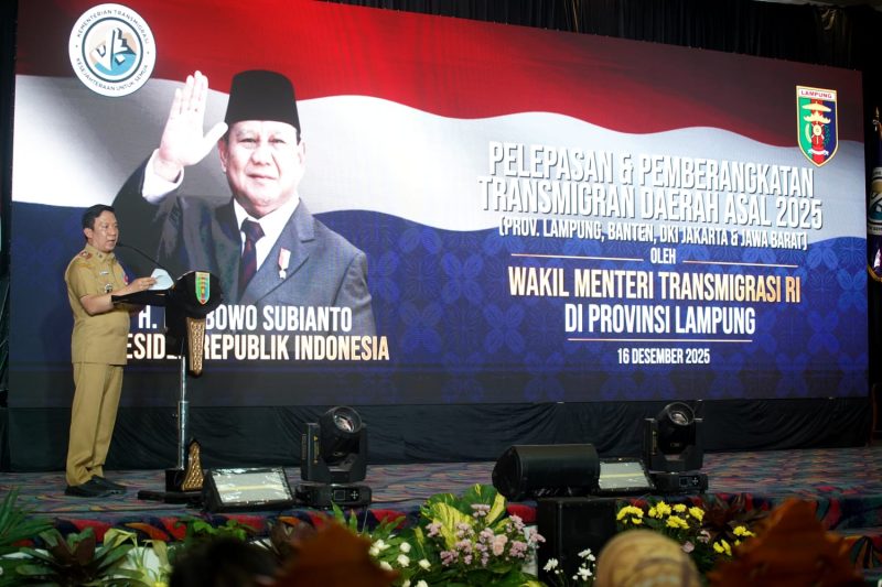 Pemerintah Provinsi Lampung mendampingi Kementerian Transmigrasi melepas 45 kepala keluarga (KK) atau 172 jiwa calon transmigran Tahun 2025 dalam prosesi resmi di Balai Keratun, Kantor Gubernur Lampung, Selasa (16/12/2025). Pelepasan dilakukan oleh Wakil Menteri Transmigrasi RI Viva Yoga Mauladi didampingi Sekretaris Daerah Provinsi Lampung Marindo Kurniawan.