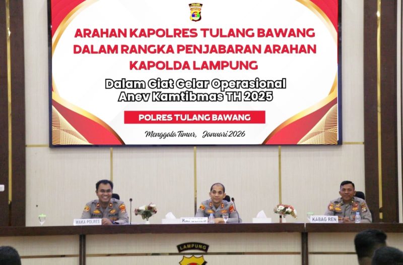 Komitmen Polri dalam menjaga stabilitas keamanan dan ketertiban masyarakat (kamtibmas) di wilayah Provinsi Lampung kembali ditegaskan. Kapolres Tulang Bawang, AKBP Yuliansyah, S.I.K., M.H., memimpin langsung kegiatan Analisis dan Evaluasi (Anev) Arahan Kapolda Lampung terkait Hasil Giat Go Anev Kamtibmas Tahun 2025, yang digelar di Aula Wira Satya Polres Tulang Bawang, Rabu (21/01/2026).