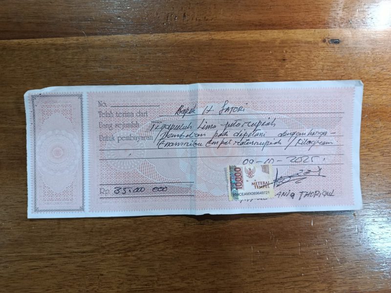 – 1 lembar kwitansi senilai Rp35.000.000,- dengan tanda tangan tersangka