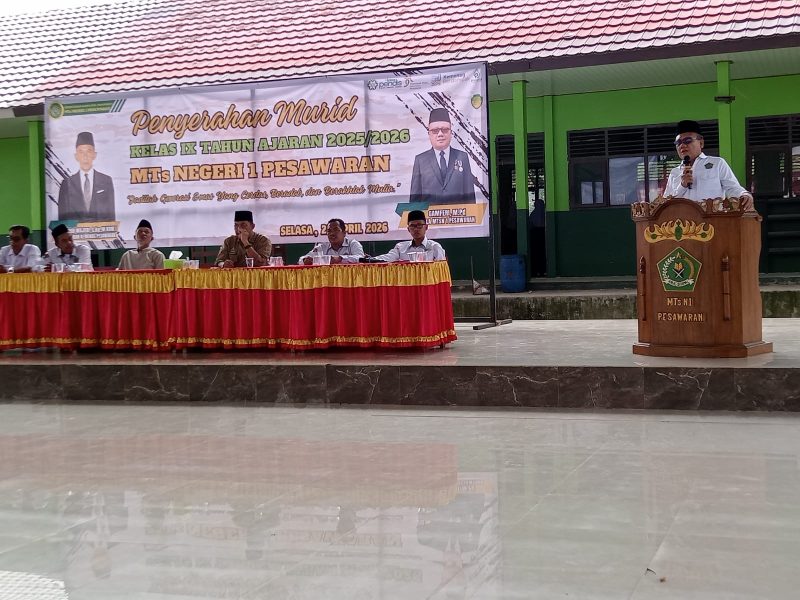 MTs Negeri 1 Pesawaran menggelar acara penyerahan murid kelas IX Tahun Ajaran 2025/2026 dengan penuh khidmat dan haru. Kegiatan ini dilaksanakan di lingkungan madrasah dan dihadiri oleh kepala madrasah, dewan guru, komite sekolah, serta para orang tua/wali murid.